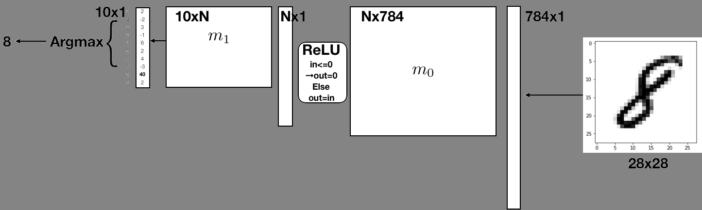 In this project we will implement a similar, but slightly more complex network which is able to classify handwritten digits. As inputs, we will use the MNIST data set, which is a dataset of 60,000 28x28 images containing handwritten digits ranging from 0-9. We will treat these images as "flattened" input vectors of size 784 (= 28 * 28). In a similar way to the example before, we will perform matrix multiplications with pre-trained weight matrices m_0 and m_1. Instead of thresholding we will use two different non-linearities: The ReLU and ArgMax functions. Details will be provided in descriptions of the individual tasks.