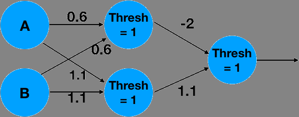 More complex functions can not be described by a simple neuron alone. We can extend the system into a network of neurons, in order to approximate the complex functions. For example, the following 2 layer network approximates the logical function XOR: