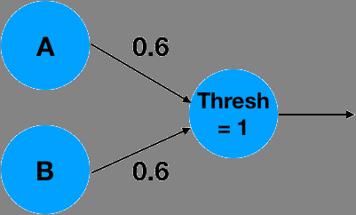 It is easy to see that for A=0, B=0, the linear combination 0*0.6 + 0*0.6 = 0, which is less than the threshold of 1 and will result in a 0 output. With an input A=0, B=1 or A=1, B=0 the linear combination will results in 10.6 + 00.6 = 0.6, which is less than 1 and result in a 0 output. Similarly, A=1, B=1 will result in 1*0.6+1*0.6=1.2, which is greater than the threshold and will result in a 1 output! What is interesting is that the simple neuron operation can also be described as an inner product between the vector [A,B]^T and the weights vector [0.6,0.6]^T followed by as thresholding, non-linear operation.